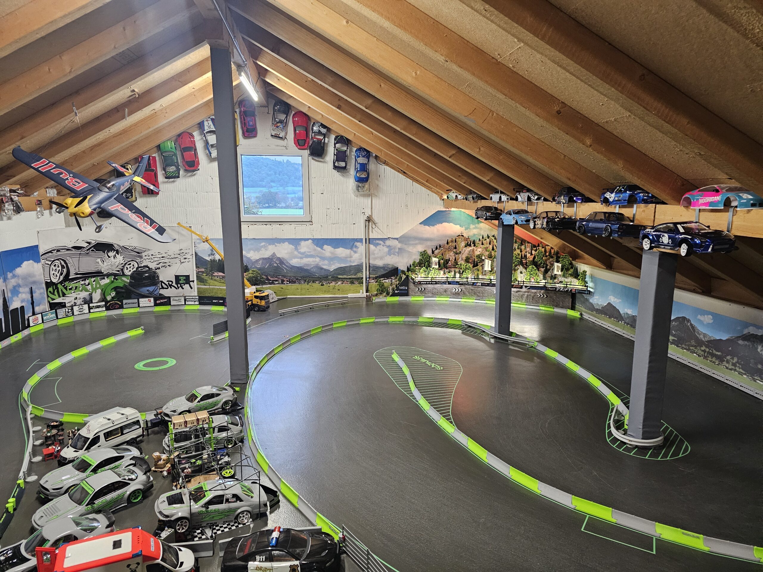 Unter dem Dach sind zahlreiche RC Drift Autos ausgestellt – ein Highlight für Fans der Schweizer Drift-Community.