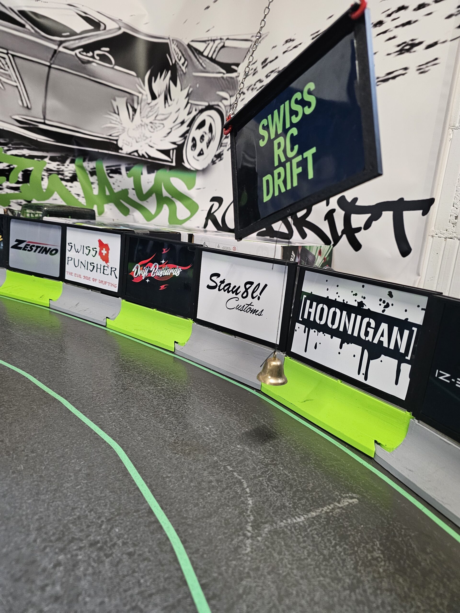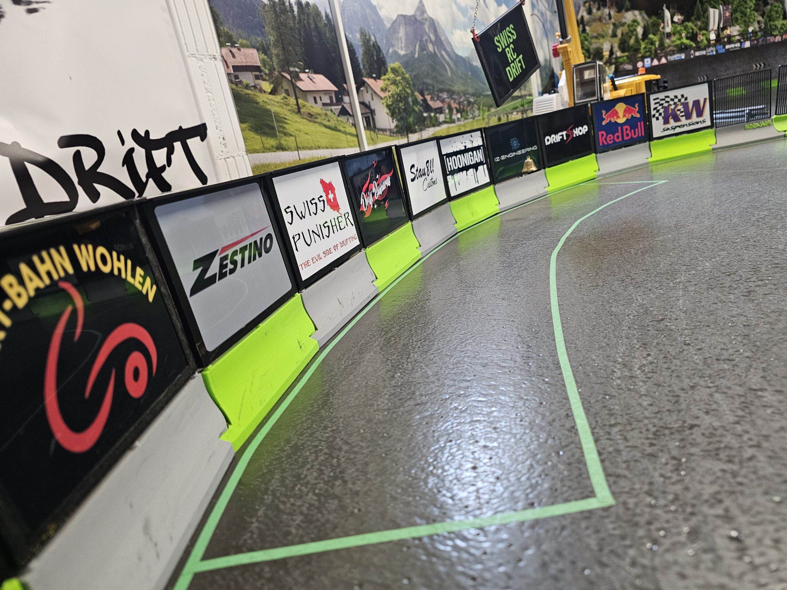 Markenwand mit Swiss RC Drift Schild und Sideways Design