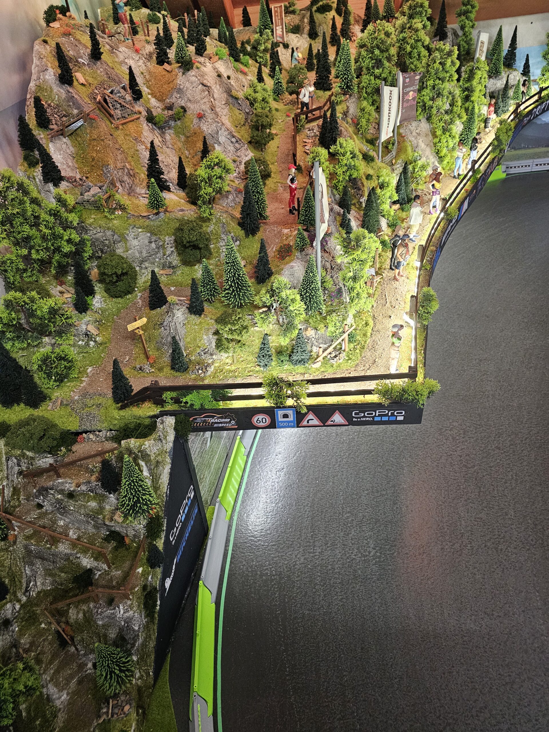 Die Szene unterstreicht die realistische Gestaltung der Anlage – mit Streckendetails wie Leitplanken, Fahrbahnmarkierungen und Modellen im Maßstab 1:10.