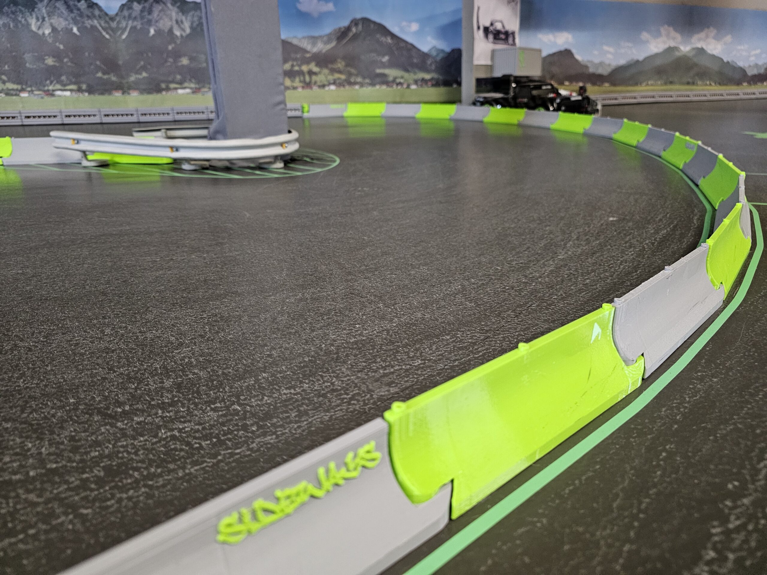 Grün-graue Leitplanke mit Sideways Logo auf der RC Drift Strecke in Dottikon