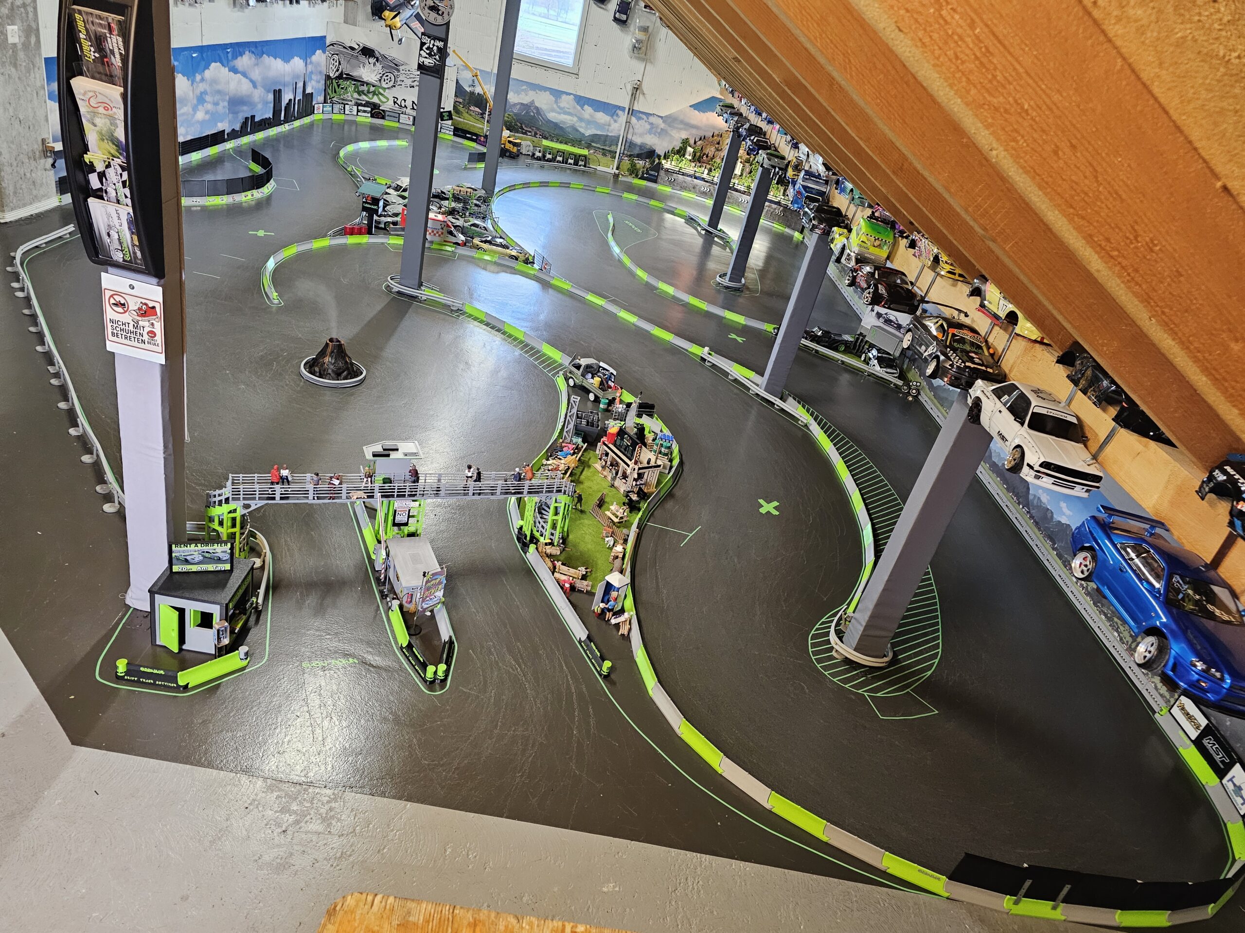 Zu sehen sind detailgetreue Kurven, markierte Driftzonen, realistische Miniaturfahrzeuge und Streckenelemente unter dem Dach der Anlage.